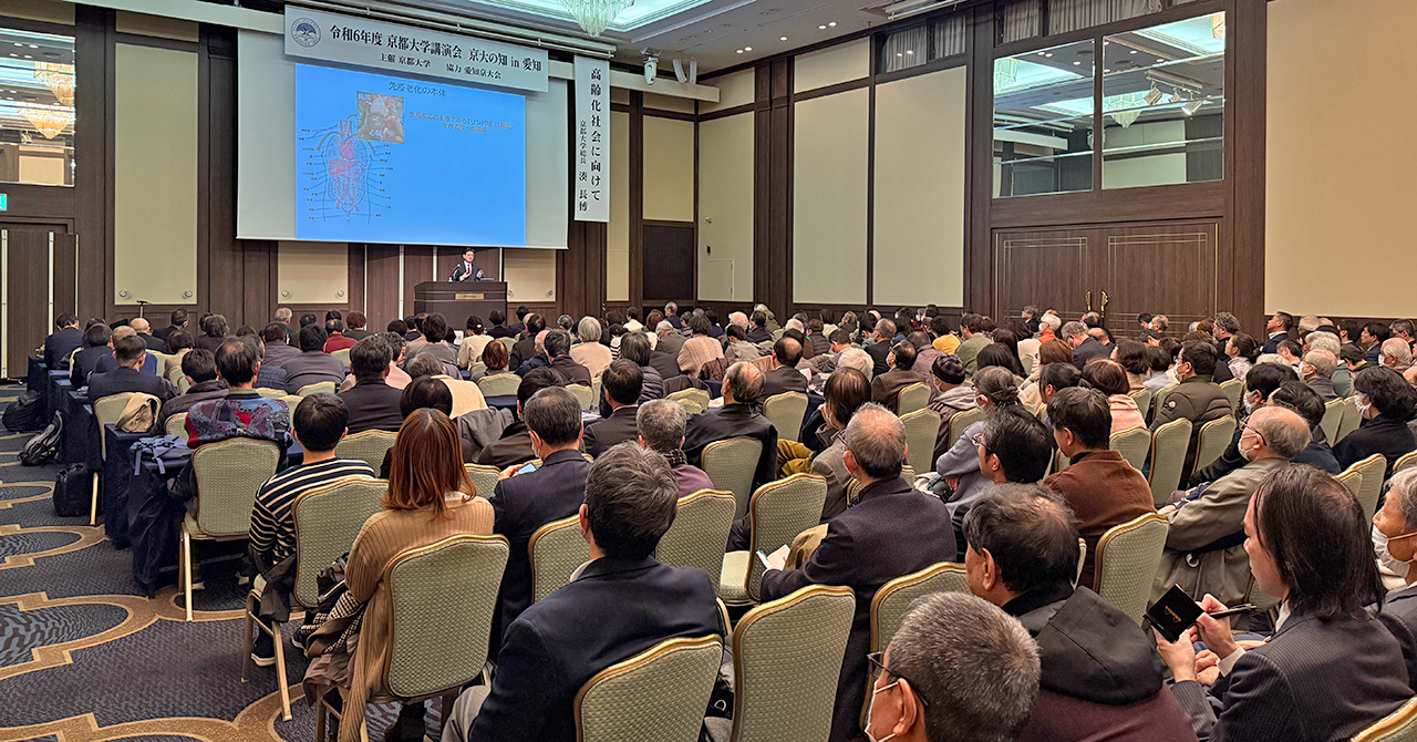 京大の知は、全国各地を巡回して京都大学の研究成果を発信することを目的とする講演会です。2024年度は愛知県の同窓会である愛知京大会の協力により実施しました。 「高齢化社会に向けて」をテーマに湊長博 総長が講演を行い、60代以降に増加する加齢関連疾患に共通する免疫機能の低下をはじめ、胸腺の退縮に伴う免疫細胞の老化と影響などを医学的に解説しました。