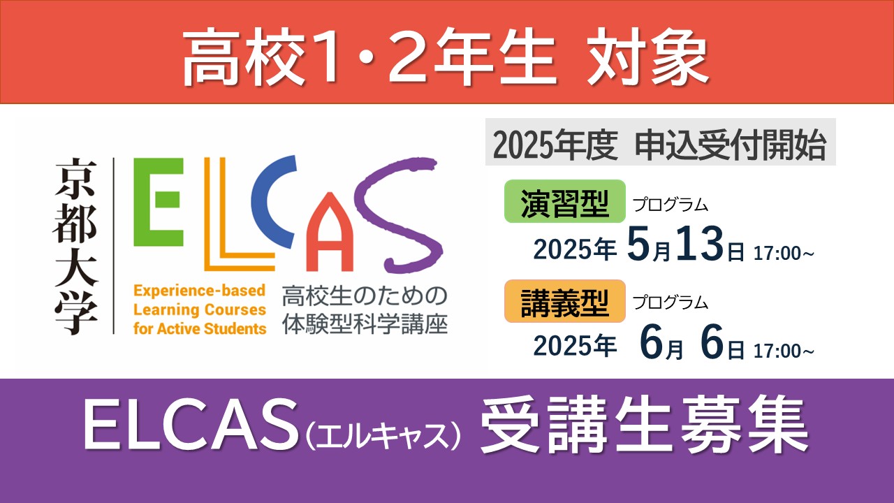 本学では、高大接続・高大連携活動の一環として、高校生のための体験型科学講座「ELCAS」の2025年度受講生を募集します。2025年度は、高校1・2年生を対象とした短期集中型企画として、「演習型」と「講義型」を開催します。