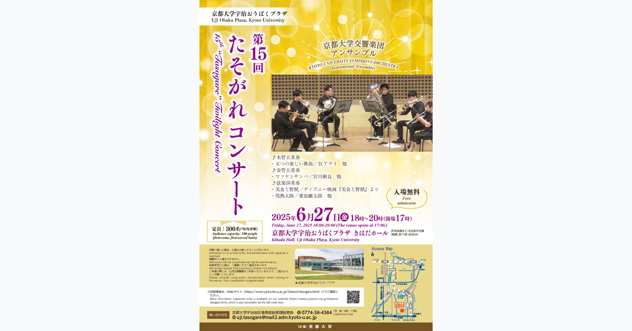 宇治キャンパスでは、地域住民の方に、宇治キャンパスに訪れてもらい、大学との交流を深めていただくことを目的として毎年行っています。今回は、京都大学交響楽団を迎えての開催となります。