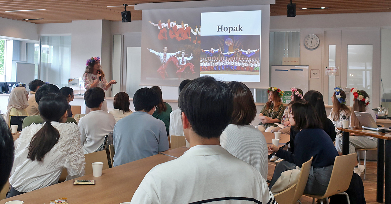 2025年5月30日に、国際交流イベント「ウクライナ文化イベント」を開催し、63名が参加しました。本イベントは、ウクライナの文化を通じてウクライナに関心をもってもらうこと、ウクライナ学生と本学学生との交流を生み出すことを目的としています。