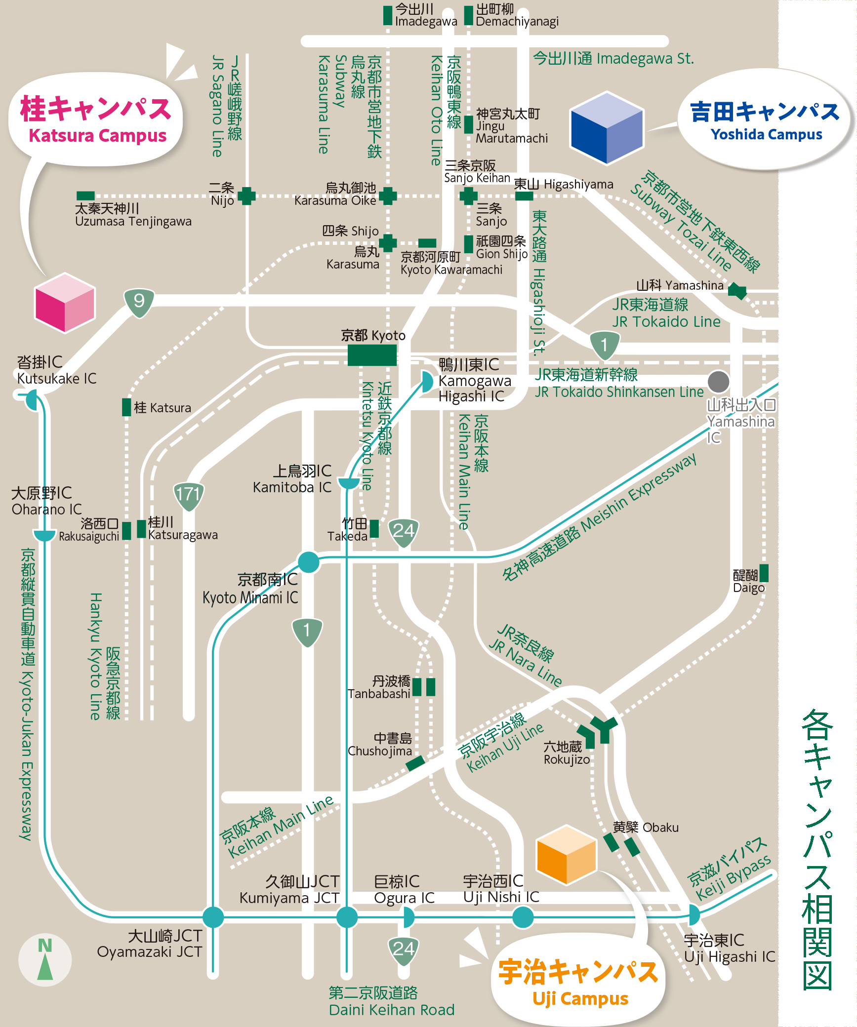 京都大学には、大きく分けて吉田キャンパス、宇治キャンパス、桂キャンパスの三つのキャンパスがあります。
