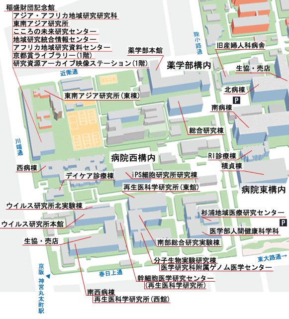 | 35 | 稲盛財団記念館 アジア・アフリカ地域研究研究科 東南アジア研究所 こころの未来研究センター 地域研究統合情報センター アフリカ地域研究資料センター 京都賞ライブラリー(1階) 研究資源アーカイブ映像ステーション(1階) |