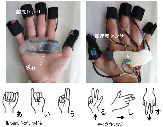 作成したアプリケーションは手話で使われる指文字を認識し、音声に変換する装置で、指文字翻訳機「TEMS (Talking Equipment from Manual Sign)」と名付けました。この装置はMEMSの加速度センサと磁気センサを組み合わせることで指の形を判別し、対応する音声に変換するものです。これにより、聴覚障害のため言葉を発することが不自由な方が、手話を知らない人に意思を伝えることができます。このアプリケーションは社会への貢献が期待されており、昨年末に毎日新聞の1面でも取り上げられました。