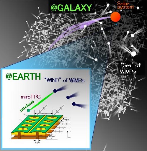 地球上で暗黒物質を直接“見る”ためには、暗黒物質との弾性散乱で跳ね飛ばされた原子核を検出します。銀河中を運動する太陽系には、暗黒物質は風のように吹き付けていると考えられているため、反跳した原子核の方向は暗黒物質の到来方向に沿うと考えられています。通常の探索実験では原子核のエネルギーのみを測定しますが、NEWAGE実験ではガス検出器を用いることで原子核の飛跡も取得し、暗黒物質の到来方向という強い証拠を得ようとしています。