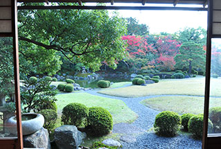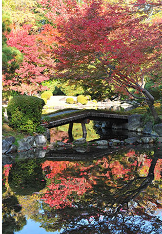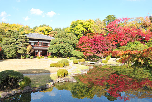 贅沢にとられた広い庭園には、丁寧に整えられた木々が完璧なまでの美しさで配置され、池には緩やかなアーチを描く小さな橋もあります。紅く萠える木々が池の水面に映り込み、さらに華やかに秋の風情を演出してくれます。まさに名庭と呼ぶにふさわしい、自然と手仕事の妙と言えます。