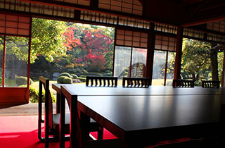 紅葉真っ只中の清風荘を訪れると、鮮やかな紅色を纏った、名庭園特有の洗練された景観美が目に飛び込んできます。紅や黄の秋の彩りに包まれた庭園、そして滋味深い端正な主屋と、実に絶妙なコントラストです。