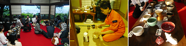 (左)過去の宇宙茶会の様子。(中央)宇宙飛行士風のつなぎ着用でお茶をたてる近藤氏。(右)宇宙をモチーフにしたお茶碗「宇宙十職」