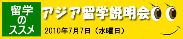 今回の案内は「アジア留学説明会」。本学もアジア各国の大学と学生交流協定をたくさん締結しています。もちろん、交換留学以外にも、可能性がいっぱい!是非この機会に説明会に足を運んで、アジア留学の魅力を体験してください!