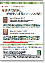 こころの未来研究センターの共同研究者(2014年5月現在)として、京都の高齢者介護に努める家族についての研究を行っているJason Danely ロードアイランド大学(米国)助教と、自死や突然死に基づく遺族の悲嘆研究の第一人者であるJohn Jordan 臨床心理士(米国在住)に、実際の事例を通して見える介護者のこころや、9.11や3.11で見られたようなトラウマ的突然死の悲嘆について、どのように理解し対応できるかについてお話していただきます。