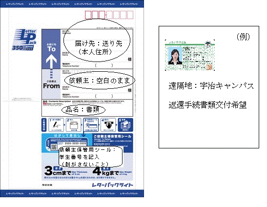 「レターパックライト」(郵便窓口・コンビニエンスストア等郵便切手類販売所で購入してください)に次の必要事項を記入し、「学生証」をコピーしたA4用紙(余白に、遠隔従事場所またはやむ得ない事情、および「返還手続書類交付希望」と記入のこと)を添付のうえ、学務部学生課奨学掛までお送りください。送付された「レターパックライト」を使用し、郵送します。