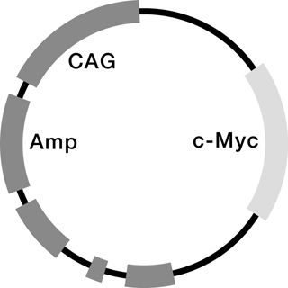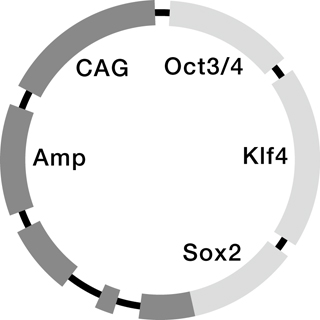 | 図1.2Aプラスミド設計図 単一の2AプラスミドにOct3/4、Klf4 、Sox2の順番で搭載。細胞に導入されたこのプラスミドから、3因子が切り離されたタンパク質として発現する。c-Mycは単独で同プラスミドに搭載。 | |