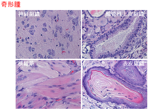 神経組織(左上)、腸管様上皮組織(右上)、横紋筋(左下)、表皮組織(右下)、などに分化することが示された。