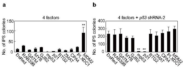 b. 同様に、マウスとヒトに共通で、発現増加した遺伝子4個、発現減少した遺伝子7個を4因子とp53shRNAと一緒にHDFに導入し、28日後に確認できたiPS細胞株の数。