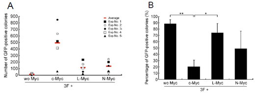 A:Mycファミリーの有無によるマウスiPS細胞のコロニー数