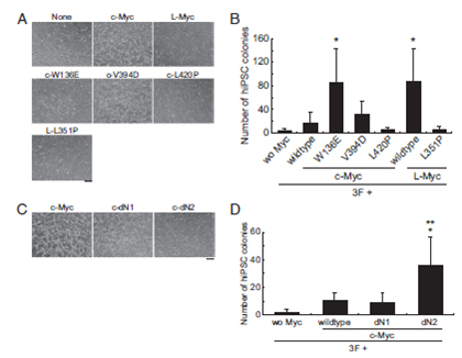 D:N末端を変異させたc-Myc変異体を用いたヒトiPS細胞の作製効率の比較