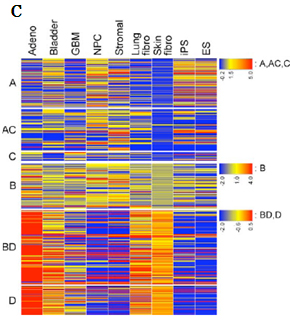 C:がん細胞、正常線維芽細胞、iPS細胞、ES細胞における遺伝子発現の比較
