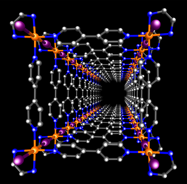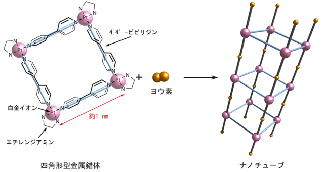 四角形型の金属錯体とヨウ素の反応から、四角柱型のナノチューブが生成する。