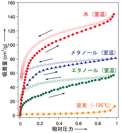 水(赤色)、メタノール(青色)、エタノール(緑色)の分子の吸着量はガスの蒸気圧とともに増加し、これらの分子がナノチューブ内に取り込まれていることが分かる。一方の、窒素(オレンジ色)は全く取り込まれていない。
