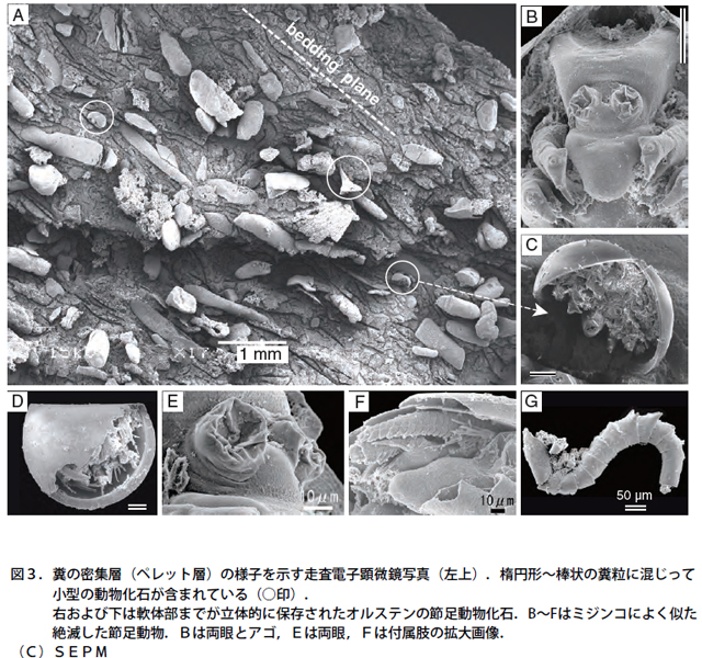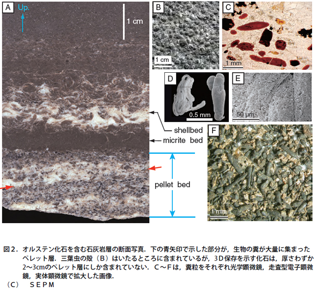 - 3D保存を示すオルステン化石の産出層準を世界で初めてcmレベルの精度で調査、糞粒が濃集している厚さ約3cmの薄い層(ペレット層)にのみ3D保存の化石が含まれていることを確かめた。