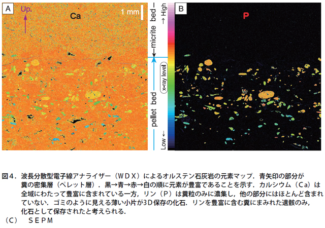 今回、京都大学・群馬県立自然史博物館の古生物学・鉱物学合同研究チームは、オルステンの3D 化石が、当時の海に棲んでいた別の生物が排泄した大量の糞(うんち)にまみれて保存されていることを初めて突き止めた。さらに、高解像度の元素マップ解析の結果から、大量の糞から化石保存の鍵になるリンが供給されて化石化するという「汚物だめ保存」の仕組みでオルステンの3D化石が保存されたことも明らかにした。