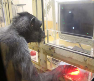 同グループは、チンパンジーにトラックボールと呼ばれる装置を用いて、モニタ画面上のカーソルを操作することを訓練した。訓練完了後のテストでは、1つではなく2つのカーソルがモニタ上に現れる。一方はダミー、もう一方は「自分が」動かしているカーソルだ。どちらのカーソルをチンパンジーが実際に操作しているのか第三者にはわからない。しかし、もし行為の主体感が成立しているのであれば、自らが意図した運動と実際の運動の結果を照らし合わせることで、自分がどちらを操作しているのか容易に認識できるはずだ。テストの結果、チンパンジーは、自分が操作しているカーソルを正しく選ぶことができた (写真参照)。つまり、チンパンジーでも行為の主体感が自己認識の重要な要因として機能していることが分かった。