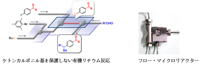 多くの有機化合物中に頻繁に見られる官能基であるケトンカルボニル基は、有機リチウム化合物と極めて速く反応するため、それに影響を与えずに反応を行う場合には一旦保護する必要があった。今回の研究は、マイクロリアクターを用い、フロー系で滞留時間を3ミリ秒~1.5ミリ秒と極めて短く精密に制御することにより、有機リチウム種を発生させ、それが分子内のケトンカルボニル基と反応する前に、後で加えたアルデヒドと素早く反応させるという、従来の常識を覆す分子変換を実現したものである。