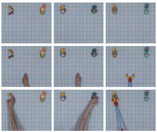 | 図1 刺激映像(左から把持行為、手のひらの行為、無生物の行為) | 図2 乳児の把持行為の計測例 |