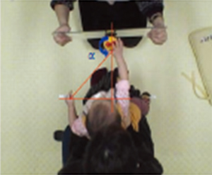 われわれは、生後4~10ヶ月児の乳児と成人を対象に、他者の行為理解能力(他者の行為の目標を予測する能力)と、乳児の観察した行為に対応する運動能力との対応的な発達関係を検証しました。他者の行為理解の発達として、3種類の映像(図1)を見ている際の行為の目標を予測する能力を計測し、乳児の運動能力の発達の指標としては、把持行為の形態的な発達を測定しました(図2)。