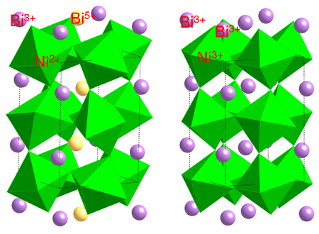 ラザフォードアップルトン研究所での中性子回折実験と、大型放射光施設SPring-8での放射光X線吸収実験から、この物質を加圧すると、ニッケル(Ni)の電子が一つ5価のビスマスに移り、ニッケルの価数が2価から3価に変化し、酸素をより強く引きつけるようになることが分かった。この際、ペロブスカイト構造の骨格をつくるニッケル—酸素の結合が縮むため、圧力の効果以上の体積収縮が起こる。さらに、ビスマスを一部ランタン(La)で置換すると、Bi5+が不安定になり、昇温によって同様の変化を起こせることも分かった。