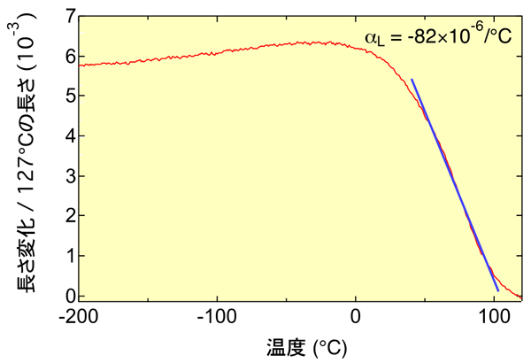 - 図2 歪みゲージで測定した、Bi0.95La0.05NiO3の長さの温度変化。7~127℃の範囲で負の熱膨張が起こっており、その線熱膨張係数は既存材料の3倍以上の-82×10-6/ ℃であることが分かる。