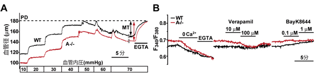 (A)腸間膜動脈の血管径モニタリング。血管内圧を変化させた際の血管径の経時変化。(B)腸間膜動脈より内皮細胞を剥離した試料を用いて、Fura-PE3を負荷した抵抗血管平滑筋の細胞内Ca2+動態を蛍光可視化イメージング解析した。細胞外溶液からのCa2+除去、Ca2+チャネル阻害薬ベラパミルまたは活性化薬BayK8644の定常状態の細胞内Ca2+濃度に対する効果を検討した。