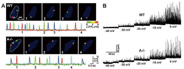(A)Ca2+スパークを全反射顕微鏡にて測定した。Ca2+スパークの代表的データ。(B) パッチクランプ法によるSTOC測定実験。STOC測定の代表的なデータ。