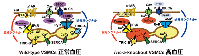 本研究は、TRIC-A遺伝子欠損マウスにおいて観察された高血圧に注目しました。この変異マウスの血管平滑筋細胞では、小胞体膜上のリアノジン受容体と細胞膜上の大コンダクタンスCa2+依存性K+チャネルによる過分極シグナルが障害されており、興奮性の亢進による電位依存性Ca2+チャネルの異常活性化も確認されました。従って、血管平滑筋の過分極シグナルはTRIC-Aチャネル、リアノジン受容体とCa2+依存性K+チャネルの機能共役により成立していることが判明しました。一方、正常血圧群と高血圧患者群におけるヒトTRIC-A遺伝子内の一塩基多型(SNPs, single nucleotide polymorphisms)を検討した結果、日本人の約7%で観察されるSNP型で本態性高血圧の発症が18%上昇することが明らかになりました。さらに、この高血圧リスクSNPsを有する高血圧患者においては、一般に処方される降圧薬3種に対して抵抗性を示すことも明らかとなりました。TRIC-Aチャネルが血圧調節に関与しているという新たな発見は本態性高血圧の病態解明へ貢献するものであり、高血圧の予防、降圧薬選択や投薬量決定などの個別化医療への展開が期待されます。