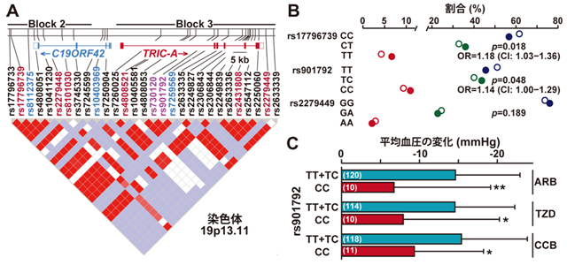 (A)TRIC-A遺伝子SNPsの高血圧ケース-コントロール試験における解析。TRIC-A遺伝子領域におけるSNPsの連鎖不均衡マップに、高血圧リスクSNPs(p<0.05)を示している。(B)各SNPsでの接合体存在比。rs17796739およびrs901792では低頻度のホモ接合体が統計上有意に高血圧を発症し、発症リスクがそれぞれ約18%、14%上昇する。一方で、rs2279449の低頻度ホモ接合体は高血圧発症リスクが低い。(C)高血圧リスクrs901792Cホモ接合体患者における降圧薬抵抗性。TRIC-A遺伝子中のrs901792において遺伝子型CCの高血圧患者は、他の遺伝子型患者と比較して3剤の降圧効果が顕著に低い。
