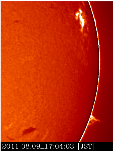 1. 図1:2011年8月9日17時(日本時間。以下同じ)に発生した大フレアの部分画像。太陽円盤の縁が見えている。画面右上の明るい領域がフレア、画面左下の暗い構造がフィラメント、右下の明るい構造がプロミネンス。フレアに伴い衝撃波が発生し、その衝撃波の伝播によりフィラメント・プロミネンスが振動を開始した。(飛騨天文台)