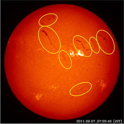 1. 図2:2011年9月7日7時に発生した大フレアの太陽全面画像。画面中央やや右の明るい領域がフレア。周辺にある暗くて細長いフィラメントがフレアに伴い振動する。このフレアでは、黄色の楕円で示した少なくとも7つのフィラメントが振動した。(飛騨天文台)