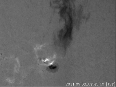 1. 図3:2011年9月8日7時30分に発生した大フレアの部分画像。太陽黒点(図中央下)の上部に見られる明るい領域がフレア。フレアに伴い右上に向かってフィラメント噴出現象が起きている。(飛騨天文台/名古屋大学STE研)