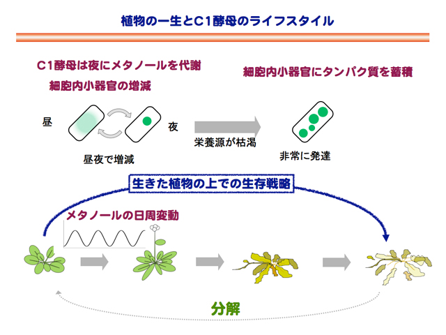 メタノール量が日周変動する植物葉上では、メタノールを食べるC1酵母が、2週間で3~4回ぐらいの分裂をすることにより、非常にゆっくりと増えることがわかった。植物の表面で、メタノールを食べるために必要な遺伝子と細胞内小器官(ペルオキシソーム)の動きを調べてみると、こちらもメタノール濃度にあわせて、昼夜で増減していた。また、メタノールを食べるための遺伝子やペルオキシソームを増やしたり減らしたりするための遺伝子が、C1酵母が植物上で増えるためには必要であった。人と同じように、C1酵母は、夜にメタノールを飲んで生活していることになる。