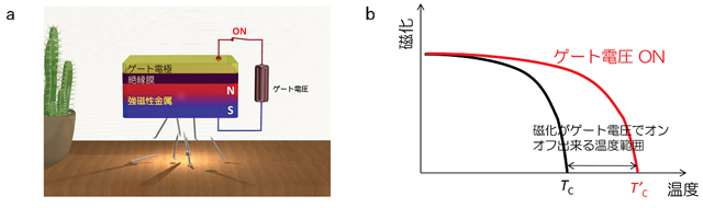 - 図1 (a)ゲート電圧で磁力をスイッチするための素子の模式図。(b)磁化の温度依存性。TCは強磁性転移温度を示す。ゲート電圧を印加することで、TCが変化する。