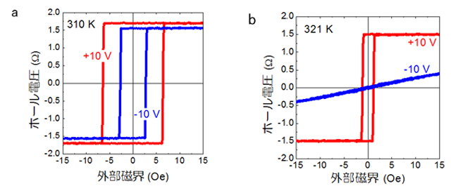 - 図2 (a)310Kでのゲート電圧印加下での磁化曲線。保磁力がゲート電圧により大きく変化している。磁化状態は異常ホール効果を用いて観測されている。 (b)321Kでの磁化曲線。正負のゲート電圧により、角型のヒステリシスから直線的なカーブへと大きな変化が観測されている。用いた試料のPt下地層の膜厚は1.1nm、Co層の膜厚は0.4nmである。