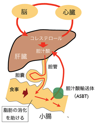コレステロールは主に肝臓で合成され、血液によって体内を循環する。血液中で過剰なコレステロールは肝臓で胆汁酸に変換され、胆汁として消化器系での脂肪の吸収を助ける。胆汁酸の大半は、胆汁酸輸送体により肝臓に戻り再利用される。