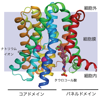 ASBTの立体構造は、10本の膜貫通したらせん構造(へリックス)が二つのドメインに分かれている。一つは、6本の膜貫通のへリックスで構成されるコアドメイン(左)で、残りの4本の膜貫通のへリックスはパネルドメイン(右)を構成している。コアドメインには胆汁酸輸送体の活性に必要なナトリウムイオンが二つ配置されている。