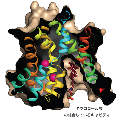 ASBTの二つのドメインの間には、くぼみのような空間があり、胆汁酸の一種であるタウロコール酸が空間に結合していました(図3)。また、このタウロコール酸の結合部位の近くのコアドメイン内に、二つのナトリウムイオンが結合していることが分かりました。この部位のアミノ酸を遺伝子改変するとASBTの胆汁酸輸送能が失われることから、このナトリウムイオンの結合部位が重要な役割を担っていることが分かります。