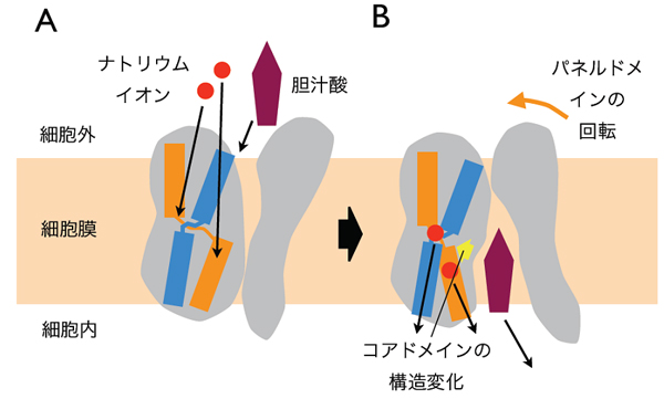 ASBTの立体構造の情報などをもとに、胆汁酸輸送体の輸送が、(A)ナトリウムイオンが細胞の外から結合することでコアドメインの構造を変化させ、胆汁酸を結合しやすくし、(B)胆汁酸が二つのドメインの間のキャビティーに結合すると、もう一つのパネルドメインが動いて、胆汁酸とナトリウムを同時に細胞内へ放出を促すことが分かった。