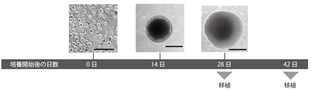 培養開始時にはバラバラであったヒトiPS細胞が細胞塊を形成しながら、ドーパミン神経細胞へと分化する。28日間と42日間培養した細胞を移植して、両者を比較検討した。