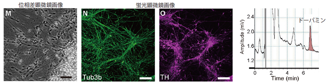 一番右の写真(O)で、多くの細胞がドーパミンを合成するための酵素(TH)を発現していたことと、ドーパミンを検出できたことから(右グラフ)、ドーパミン神経細胞であることがわかった。