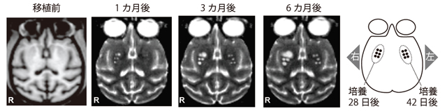 左右に6箇所ずつ移植し(中央前方よりの白い点)、6ヶ月後も細胞が生存していることが確認できた。28日間培養した細胞(右側:R)と比べると、42日間培養した細胞の方が移植片が小さい。