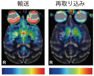 ![]() | 図4 PETによるドーパミン神経細胞の機能解析 ドーパミン神経細胞内で合成されたドーパミンは、細胞内を輸送され、細胞外に分泌されると再び細胞内に取り込まれる。 移植箇所で赤色に近づいていることから、ドーパミンの輸送、再取り込みという機能があることと、42日間培養した細胞の方がより強く機能していることが確かめられた。 |