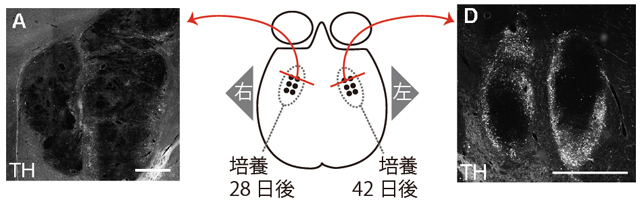 ドーパミンを合成する酵素(TH)を示す白い細胞が28日間よりも42日間培養した細胞の方が多くみられ、ドーパミン神経細胞がより多く生着していることが確かめられた。