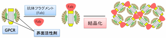 精製したGPCRは親水性領域が小さいため界面活性剤に覆われてしまい、結晶の格子が形成されにくい。GPCRの立体構造を認識する抗体フラグメントを用いて、親水性領域を拡張させて結晶性を向上させる手法